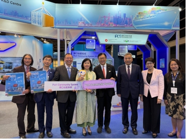 香港特别行政区政府运输及物流局局长陈美宝女士(左四)、香港贸易发展局主席马时亨教授(右四)、香港贸易发展局总裁张淑芬女士(右二)亲临LSCM的展位参观,了解LSCM研发的最新物流业相关技术。