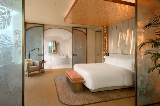 尊尚两房式及尊尚套房由128平方米起,设有室内私人泳池、日光浴床、铺满马赛克地板的绿色天河石大理石浴室,以及各种精妙手工细节。睡房以人手绘制LaLa Curio的丛林风格墙饰点缀,并延伸至如树冠般的天花上。